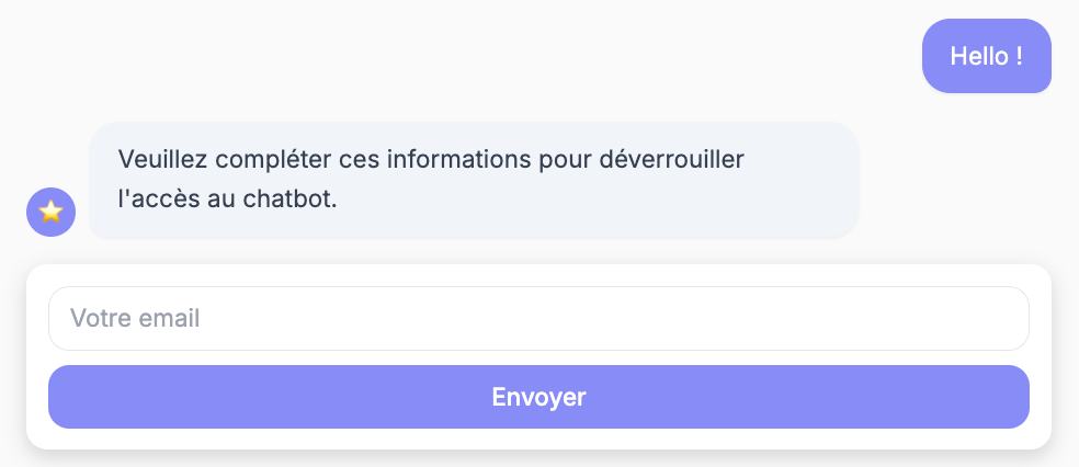 On peut activer cette option pour demander Ă lâutilisateur d'indiquer son email / WhatsApp pour dĂ©bloquer le chatbot